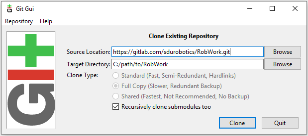 Right-click on your desktop or somewhere in explorer. Choose “Git GUI Here”, then “Clone Existing Repository”. Insert the resporitory URL as shown below, and specify the target directory. The target path must be a non-existing directory. Press Clone and wait. When done, the main Git window will open. You can just close this Window.
