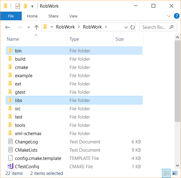 The bin folder will hold the compiled executables (for RobWork this will be unit test executables) and DLL’s for shared libraries.